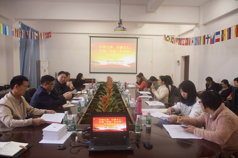 为深入贯彻落实习近平新时代中国特色社会主义思想和党的十九大精神,引导广大高校教师以德立身、以德立学、以德施教、以德育德,深入落实立德树人根本任务,根据学校有关文件精神,12月11日下午,国际文化交流学院在104会议室开展“以德立身、以德育人 争做‘四有’好老师”专题网络培训。学院党总支书记林尧俊、院长杨云升、副院长李小北、副院长赵志清以及全院教职工参加了培训。