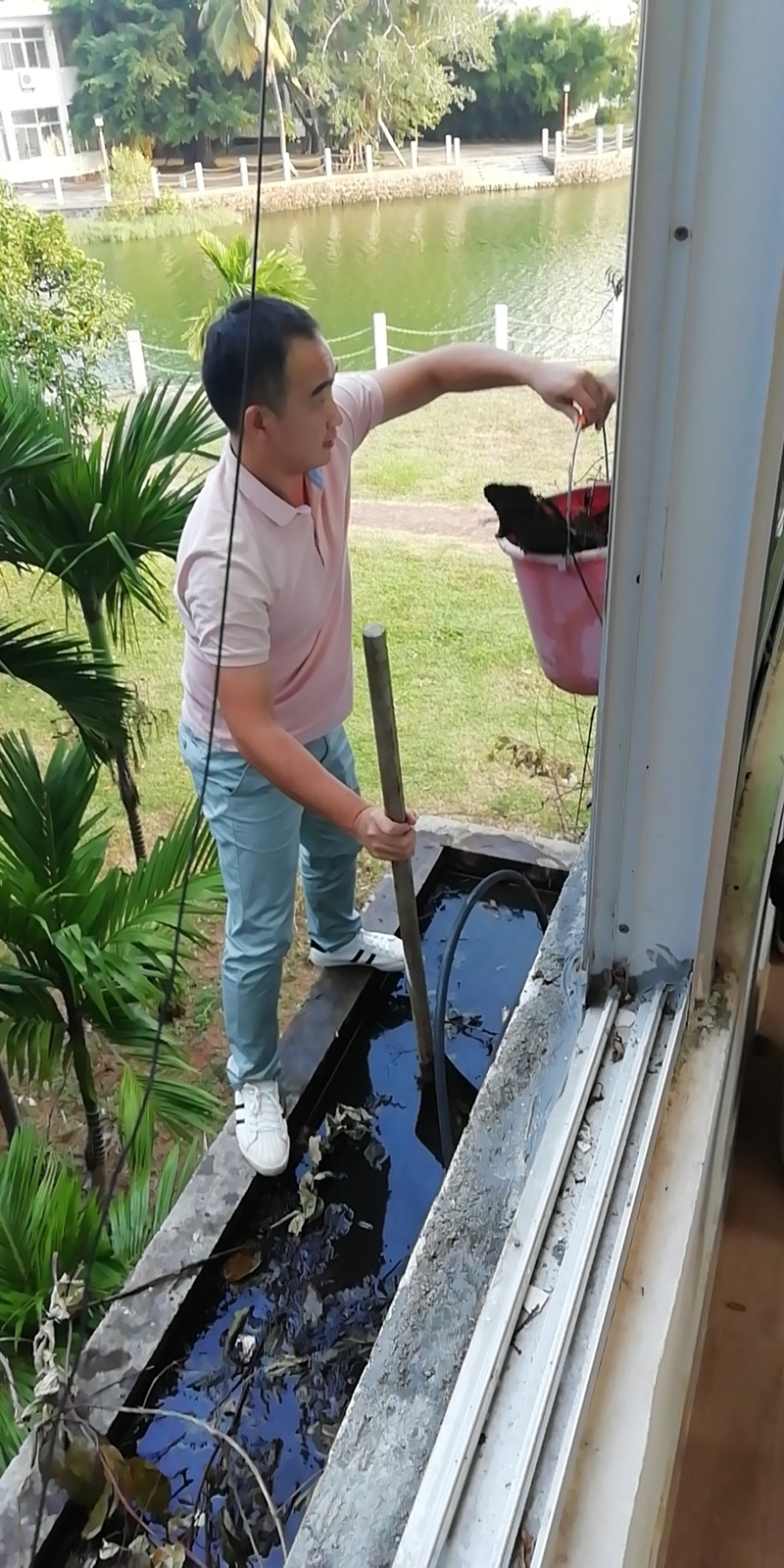 图5.综合办王晓东正在清理二楼水槽积水和杂物。