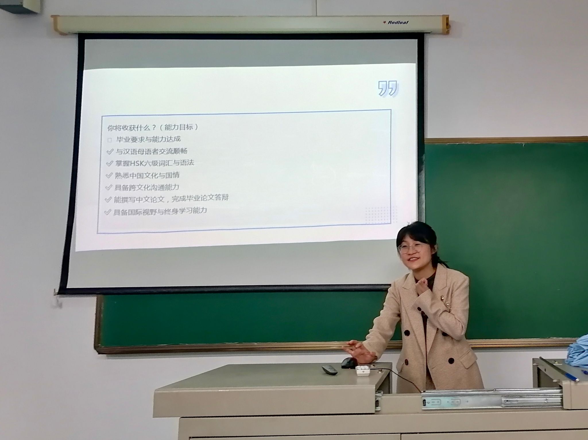 黄主任围绕“学中文,懂中国,连接世界”主题展开,系统介绍了汉语言专业定位及申请要求,该专业旨在培养具备扎实汉语能力、跨文化交际能力与中国国情认知的复合型人才,服务多领域需求。专业课程体系分层递进,涵盖语言、文化、实践类课程,修满153学分且通过HSK6级可获文学学士学位。此外,黄主任还介绍了第二课堂活动、就业方向等。
