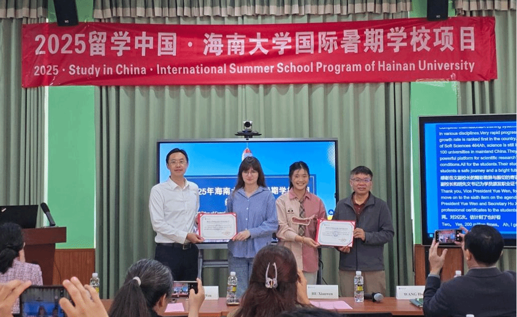 最后,岳文副校长和胡先文为学员颁发结业证书。该项目由国际合作交流处统筹,材料科学与工程学院具体实施,旨在以国际化人才培养为抓手,推动科技交流与人文互鉴,为海南自贸港高水平对外开放注入青春活力,助力构建人类命运共同体。